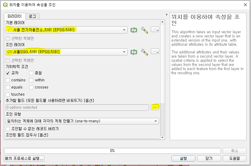 기본 레이어: 전기차충전소 데이터에 행정구역의 이름에 대한 속성 값을 결합하고 싶은 것이기 때문에 기본 레이어는 전기차 충전소 데이터로 설정해준다.