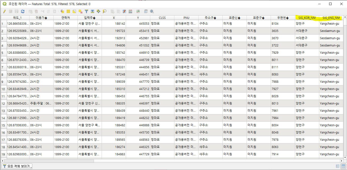 위의 과정에 따라 실행을 누르면, '조인된 레이어' 이름의 임시 레이어가 생성된다. 속성 테이블을 열어 확인해보면, 우측 맨 끝 열에 시군구 이름이 포함되어 있는 것을 알 수 있다. 따라서 자치구별 전기차 충전소의 개수 등을 구할 수 있게 된다.