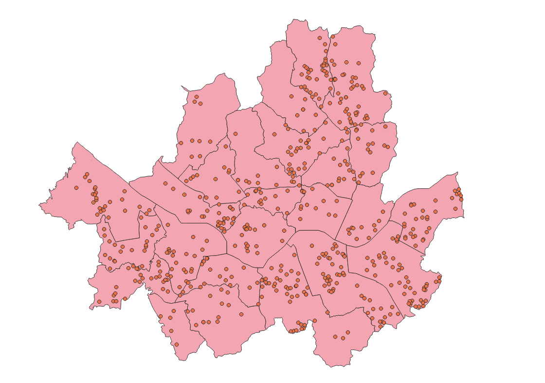 전기차 충전소의 점데이터와 자치구 행정경계 데이터를 불러오면 다음과 같은 화면이 뜰 것이다. 이때, 만약 우리가 전기차 충전소의 주소를 모른다고 가정하고, 각 자치구별 전기차 충전소의 개수를 알고 싶다면 어떻게 해야할까? 점 데이터의 객체가 몇개 안된다면 직접 세는 방법도 있겠지만, 이 전기차 충전소 데이터의 객체는 578개로 하나하나 세기에는 귀찮기도 하고 정확도도 떨어진다.