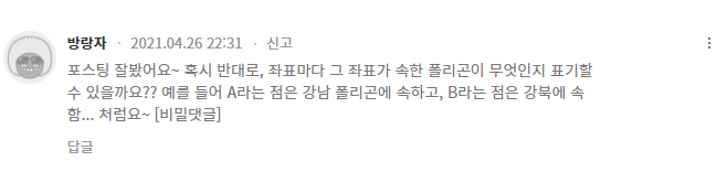 어느날 블로그에 들어왔더니 댓글 알람이 있었다. 처음 달린 댓글이었는데, 그 내용은 좌표(포인트 데이터)가 속한 폴리곤이 무엇인지 표기할 수 있는 방법에 대한 질문이었다. 안그래도 내 블로그를 찾는 분들이 어떤 것을 궁금해하는지 알고싶었는데, 이렇게 댓글로 질문을 남겨주셔서 참 좋았다. 그래서, 답댓글로 답을 드렸지만 이런 것이 궁금할 다른 분들을 위해 포스팅을 작성하려고 한다.