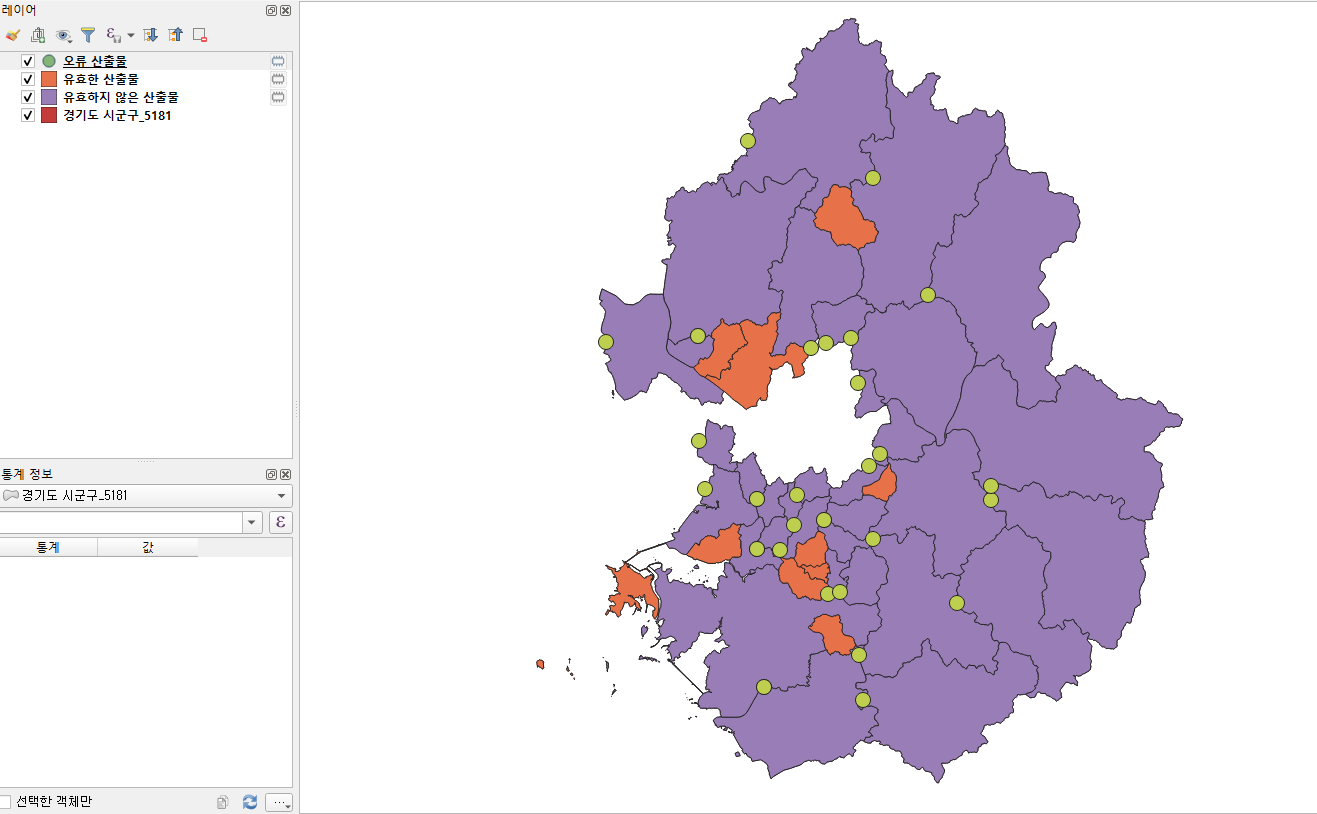 도형 수정으로 수정한 레이어에 대해 무결성 검증을 통해 확인을 하는 과정도 필요하다고 생각한다. 그래야 확신을 가지고 편하게 다음 단계로 넘어갈 수 있기 때문에,, 다행히 무결성 검증을 해보니 이와 같이 모든 폴리곤이 유효한 출력물로 나타났고 다음 단계의 분석들이 가능했다.