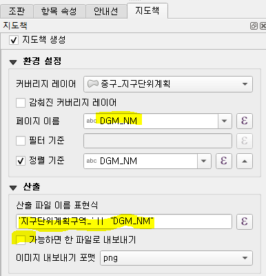 다음으로는 페이지 이름을 설정해준다. 중요한 과정은 아니나 편리함을 위해 설정해주는 것이 좋다. 그러고나면 산출파일에 대한 설정을 해야한다. 파일 포맷을 설정하고 그 위에 보면 '가능하면 한 파일로 내보내기'가 있는데, 이것을 해제하면 산출 파일 이름 표현식을 설정해줄 수 있다. 필자같은 경우는 알아보기 쉽게 ['지구단위계획구역_'|| "지구단위계획구역 명 필드"]로 해준다. 이렇게 하면 추후에 출력물 이름이 '지구단위계획구역_퇴계로변 지구단위계획구역'과 같이 된다.