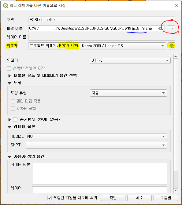 "좌표계 변환을 원하는 데이터 우클릭-내보내기-객체를 다른 이름으로 저장"을 눌러보자. 아래의 화면이 뜰텐데, 빨간색으로 표시한 파일이름 옆의 버튼을 눌러 저장 경로 및 파일명을 설정하고, 형광펜으로 표시한 좌표계를 눌러 변환하고 싶은 좌표계를 선택한다(이 경우에는 시군구 데이터 좌표계인 EPSG:5179). 이때 하나의 팁은, 파일명을 설정할 때, 뒤에 좌표계 코드를 써주는 것이다. 이러면 헷갈리지 않고 좋다.