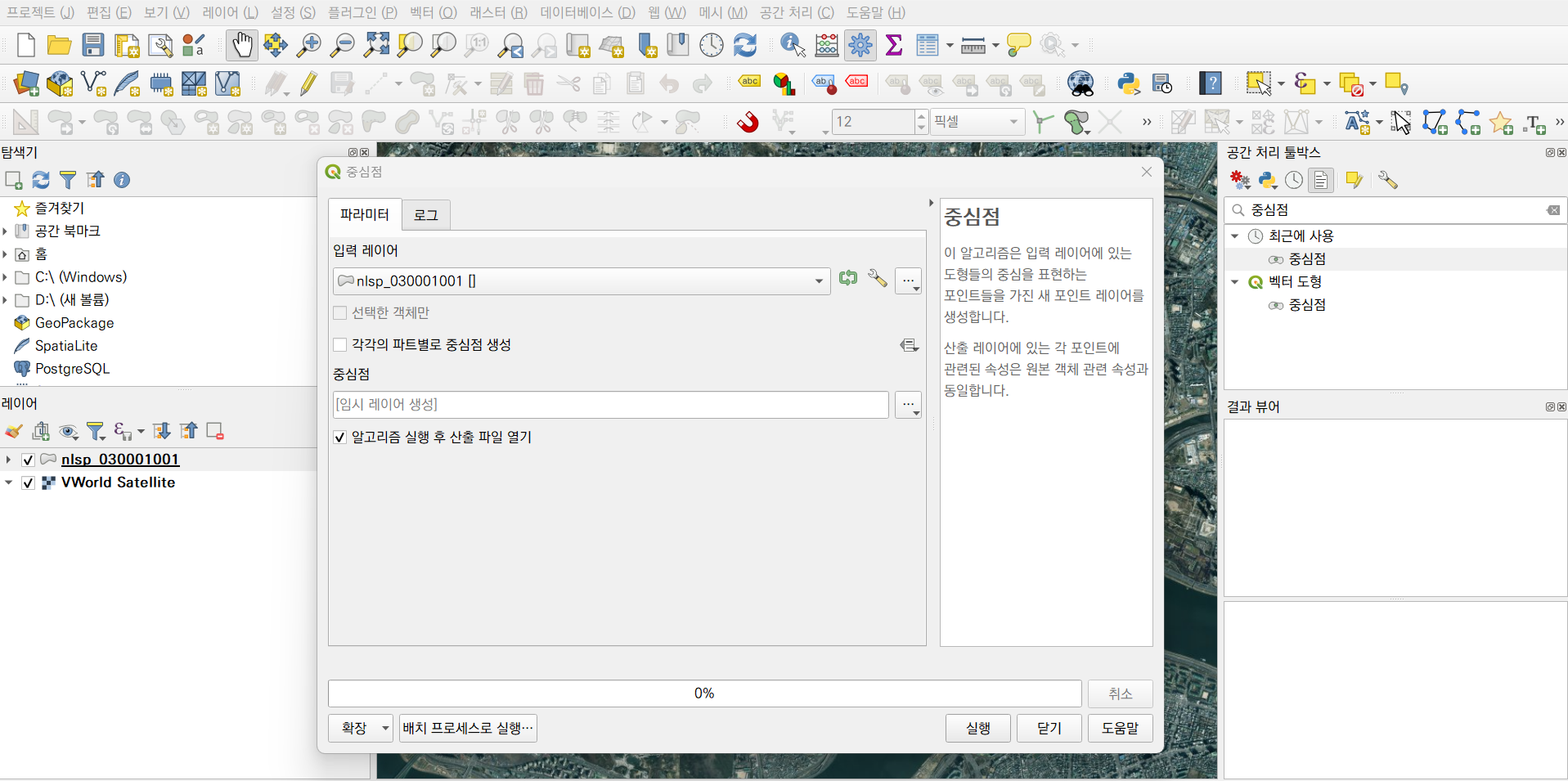 다음은 격자를 중심점으로 변환하는 과정이다. 공간 처리 툴박스에 중심점을 검색하면, 아래와 같은 창이 뜬다. 입력 레이어에 격자레이어와 같이 포인트로 변환하고자 하는 데이터를 넣어주면 끝이다. 이후 실행을 누르면, 폴리곤이 중심점 위치의 포인트로 변환된다. 만약 시각화된 결과와 다른 위치에 중심점이 생겼다면, 시각화 결과는 val 값이 유효한 곳에만 나타난 것이기 때문에 NULL값인 객체는 시각화 결과에서 누락되나 중심점은 모든 객체에 대해 만들어지는 것이기 때문이다.