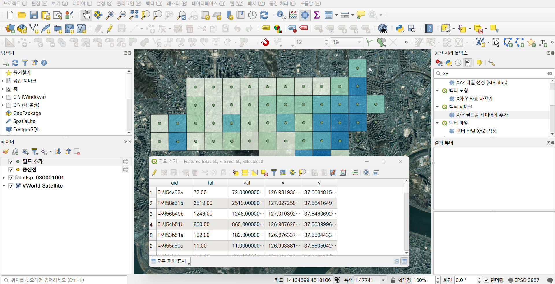 그럴 경우, 포인트 데이터의 x, y 좌표값을 따로 추출하여 속성값에 추가할 수 있기 때문에 이 방법을 소개하고자 한다.