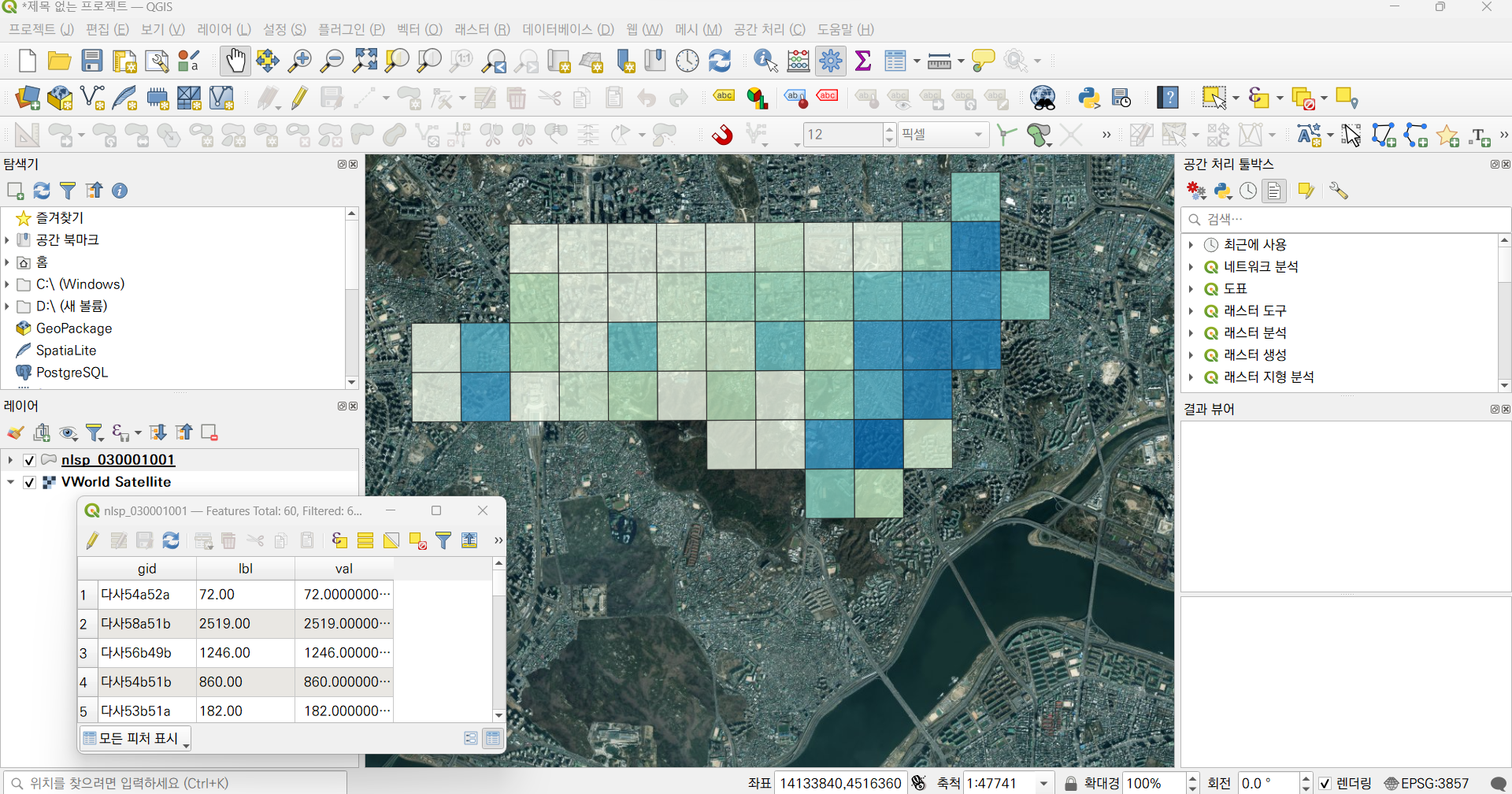 데이터를 불러와서 속성테이블을 열어보면, val 필드에 총인구수 값이 입력되어 있다. 아래의 그림은 val 값을 기준으로 시각화한 결과이다.